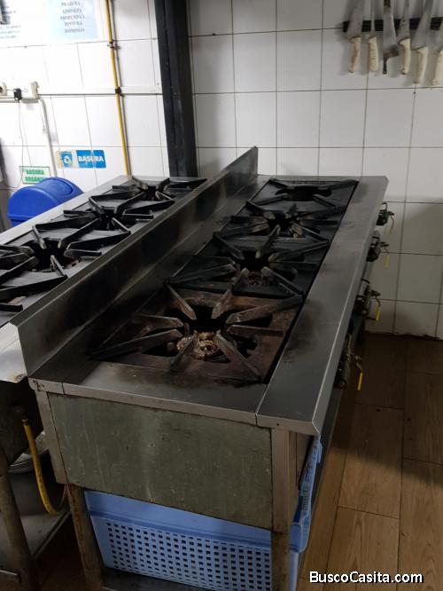La Cocina cuenta con: 12 hornillas industriales, 1 plancha grande de 4 flautas, campanas de acero con sus respectivos ductos de ventilación y el motor extractor de olores.