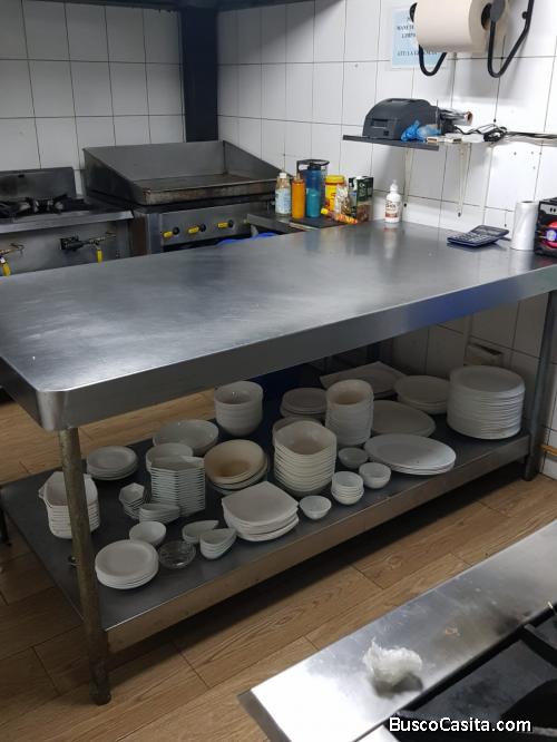 1 mesón central grande de 2 m de largo por 1.2 m de ancho, tiene pecho y contra pecho reforzado que soporta el peso de la vajilla.