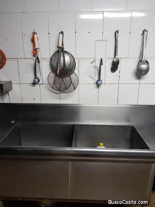 3 pozos para lavado de alimentos, ollas y vajilla profundos independientes con mesones de apoyo cada uno.