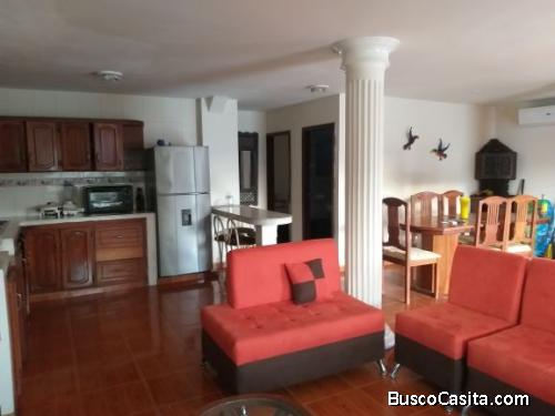 En planta baja: sala, comedor, cosina con muebles altos y bajos, 2 dormitorios con closets, 1 baño completo, área social, aire acondicionado.