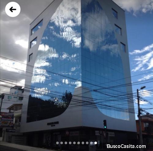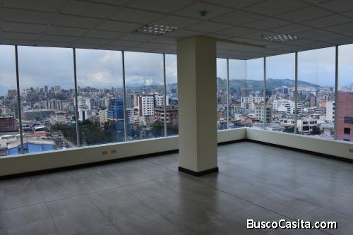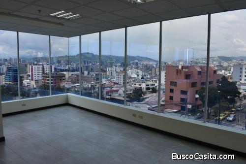 Oficina nueva con ventanales piso a techo 5to piso esquinera vista panorámica. Sector seguro y estratégico cerca de empresas públicas y privadas, hospitales, clínicas, colegios acceso o salida ágil al norte o sur de la ciudad por avenidas 10 agosto u occidental.a una cuadra de paradas de bus servicio público y el nuevo Metro de Quito a 5 minutos del parque la Carolina y sector Financiero de la capital. Edificio con todos los sevicios y seguridad