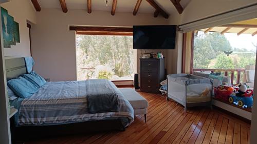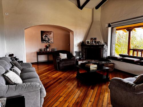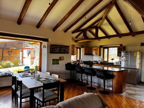 Dispone también de una piscina privada al aire libre, hermosos jardines, amplias áreas verdes, frutales y con una vista espectacular; sus acabados son elegantes y la madera es el material principal