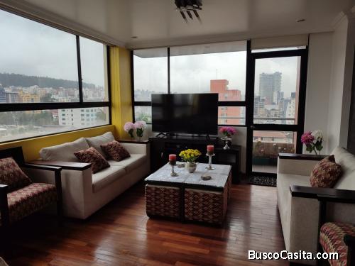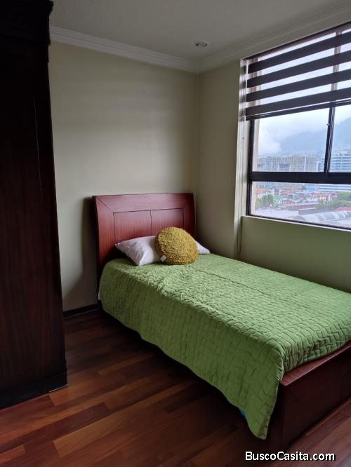 Excelente ubicación, cerca de parques, centros comerciales. Departamento de 3 dormitorios, amoblado, sala comedor cocina equipada, área de lavandería y secado, último piso, excelente vista para todos los lados. Garaje, línea telefónica e internet. Seguridad en el edificio. Favor solo personas interesadas no corredores de bienes raíces. Gracias!