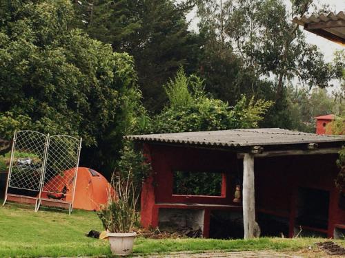 Su topografía es irregular, situación que facilita el diseño de un proyecto turístico; la propiedad dispone de varias edificaciones tipo rústicas, como: Casa antigua de cangahua, una casa de 3 dormitorios en buen estado de una planta con chimenea, sala comedor y cocina; área de BBQ o azadero, una piscina en funcionamiento, canchas deportivas de Fulbito y voleyball, cascada, 3 criaderos de peces, área de Camping, 10 estacionamientos, frutales, jardines y espacios verdes