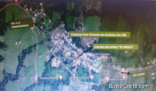 Bonita casa, construida en un terreno de 720 mts. Ubicada en la comuna de San Vicente de Andoas, km. 108 de la vía Calacalí la Independencia. Perteneciente al Cantón Pedro Vicente Maldonado al Noroccidente de Pichincha. La casa es esquinera y está situada en la avenida principal, tiene dos plantas de hormigón, frente a ella existe otra construcción de dos locales comerciales. De igual forma en la parte de atrás, tiene una área de barbacoa, cancha de volley de arena, con graderios y cubierta. Gran parte de la casa tiene muro de hormigón. Tiene una terraza, sobre los locales comerciales que dan a la avenida principal, posee una zona de garaje para 3 autos. El precio es negociable, al igual se realiza cambio con terrenos. Para mayor información comunicarse con la señora Celeste Lucero al 0981891171, o con el señor Dario Arpi al 0997570897. Si existiera un interés, luego de la llamada, se programara una visita guiada para que conozcan el inmueble.. #sanvicentedeandoas #pedrovicentemaldonado #ventadecasa #cambioporterreno #